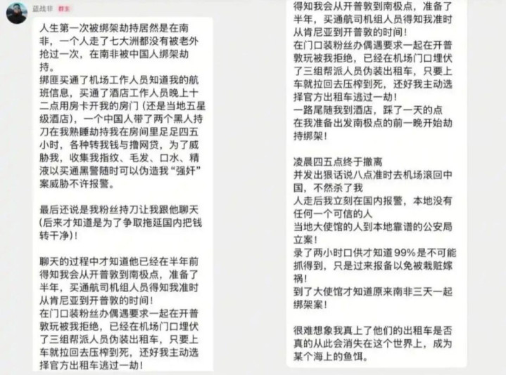 国外网站有知情东说念主爆料,南非自从疫情之后,就运行把中国东说念主当绑架蓄意,岑岭期一个月能绑七个中国东说念主。