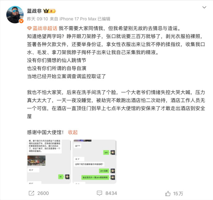 蓝战非在网上发布我方的恐怖遇到后,网友们的响应南北极分化。